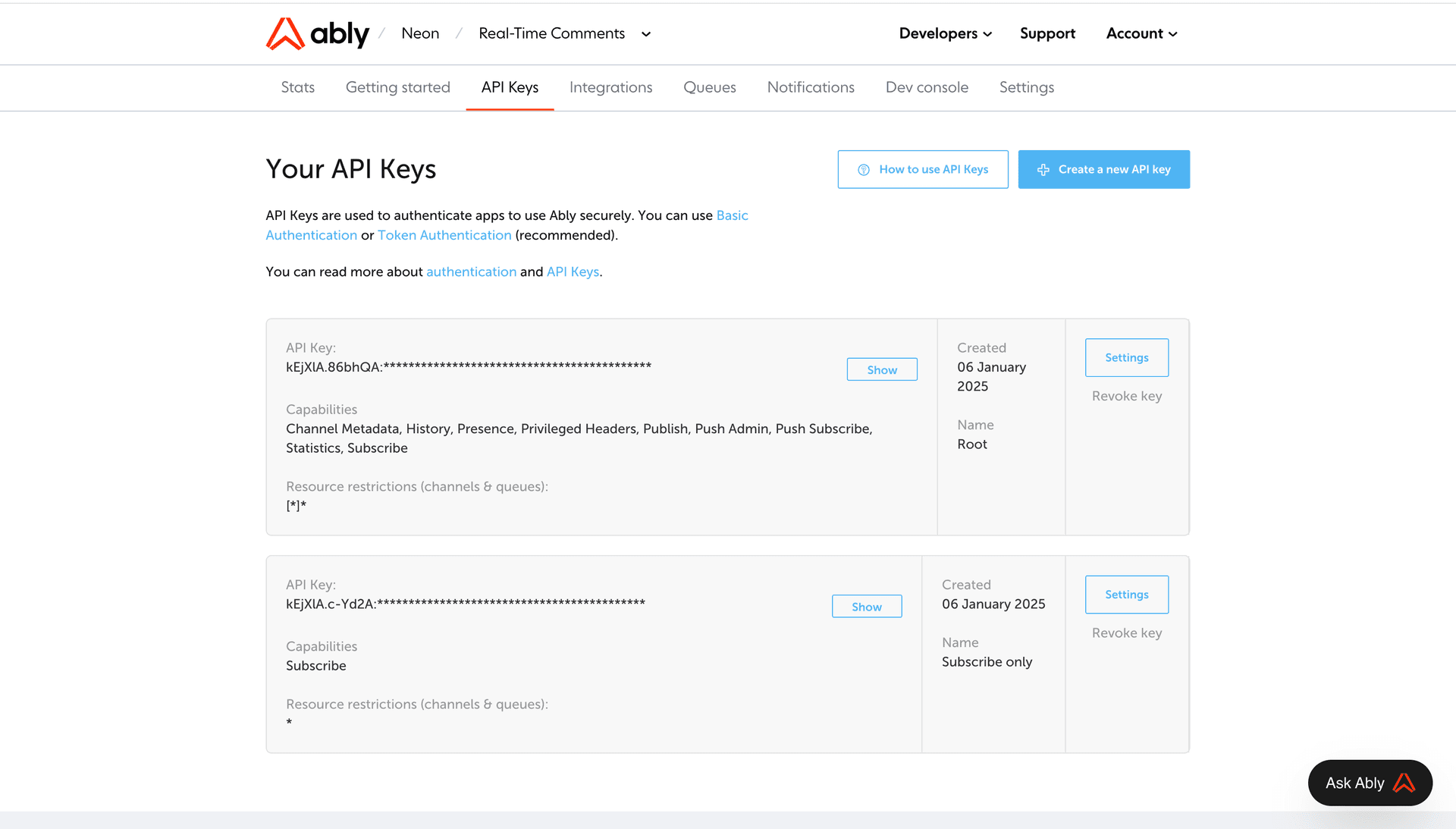 Use this API Key as an environment variable designated as NEXT_PUBLIC_ABLY_API_KEY in the .env file.
