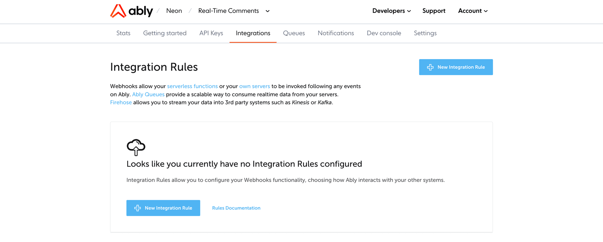 Next, go to the Integrations tab and click on + New integration rule.